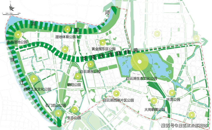板块生态环境建设更加速发展,以3000亩白云湖和珠水湿地为基底,构建绿湖花海珠水环抱点轴共生景观格局,建设300m进公园的优质公共生态,为城市提供绿色健康的产业办公和生活环境。