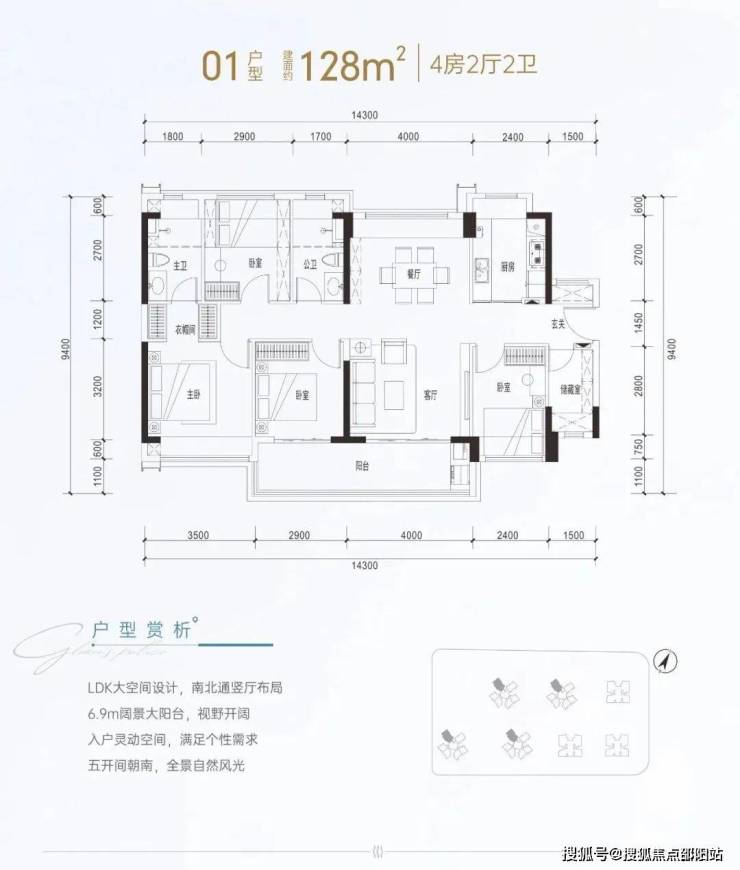 建面约128㎡属于南北通透竖厅格局,客厅进深7.1米(不含阳台),开间4米,配有6.96米宽景阳台,主卧套间设计,配有衣帽间和三段式卫生间。这个户型除通透性比传统横厅更优异外,静区部分的静溢性也会比较好,居住舒适性更佳,受众也是老少皆宜。