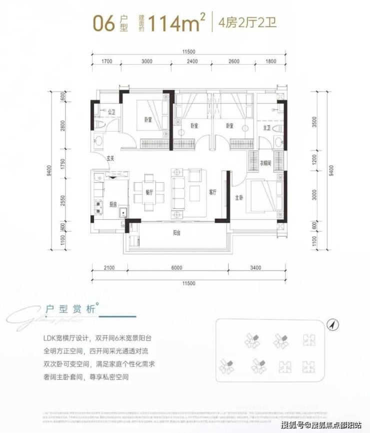建面约114㎡是传统短进深大开间横厅格局,通透性很好,客厅进深6米,开间4.3米(不含阳台),配有6米宽景阳台,主卧套间设计,配衣帽间和三段式卫生间,这个户型很比较讨喜年轻的购房群体。
