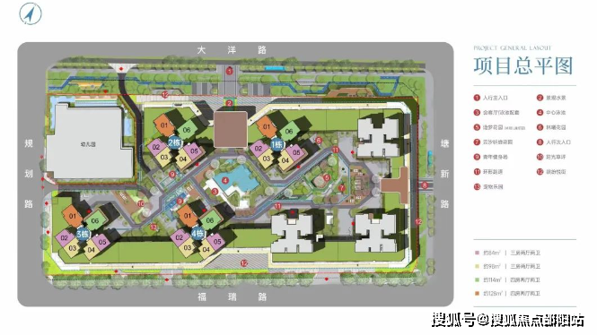 建面约84㎡三房两厅两卫,约98㎡三房两厅两卫,约114㎡四房两厅两卫,约128㎡四房两厅两卫,共计4个面积段产品。