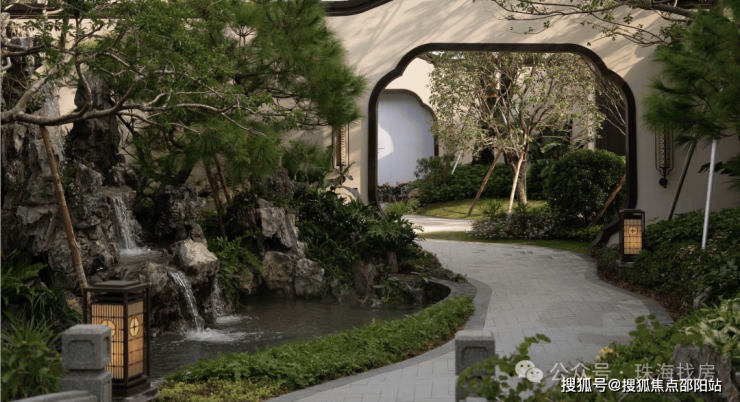 园林选用大树、特选老桩等在入园提升价值感,厚重的额绿荫结合热带。风情打造岭南特色诗意情境,凸显典藏级府邸厚重、尊贵的底蕴。
