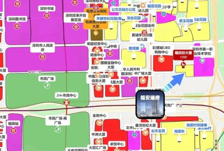 区块价值:南侧临近深圳城市主干道深南大道,是深南大道旁又一地标性建筑;东侧临近福彩路,俯瞰整个福田CBD;