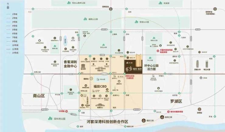 地铁:项目属于岗厦北地铁口项目,岗厦北汇集有地铁2号线(8号线)、10号线、11号线、14号线;另外,项目距离莲花村地铁口步行距离约720米,可搭乘地铁3/10号线