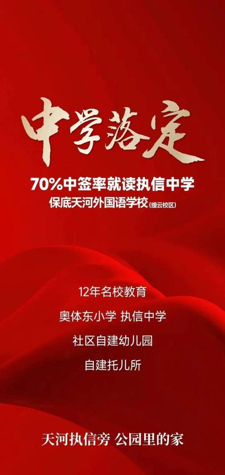 前几天正式官宣对口初中——70%中签率就读执信中学,保底是天河外国语学校,小学对口是奥体东小学,妥妥成了一个名校盘。(具体就读政策,还以当年教育局地段划分为准)