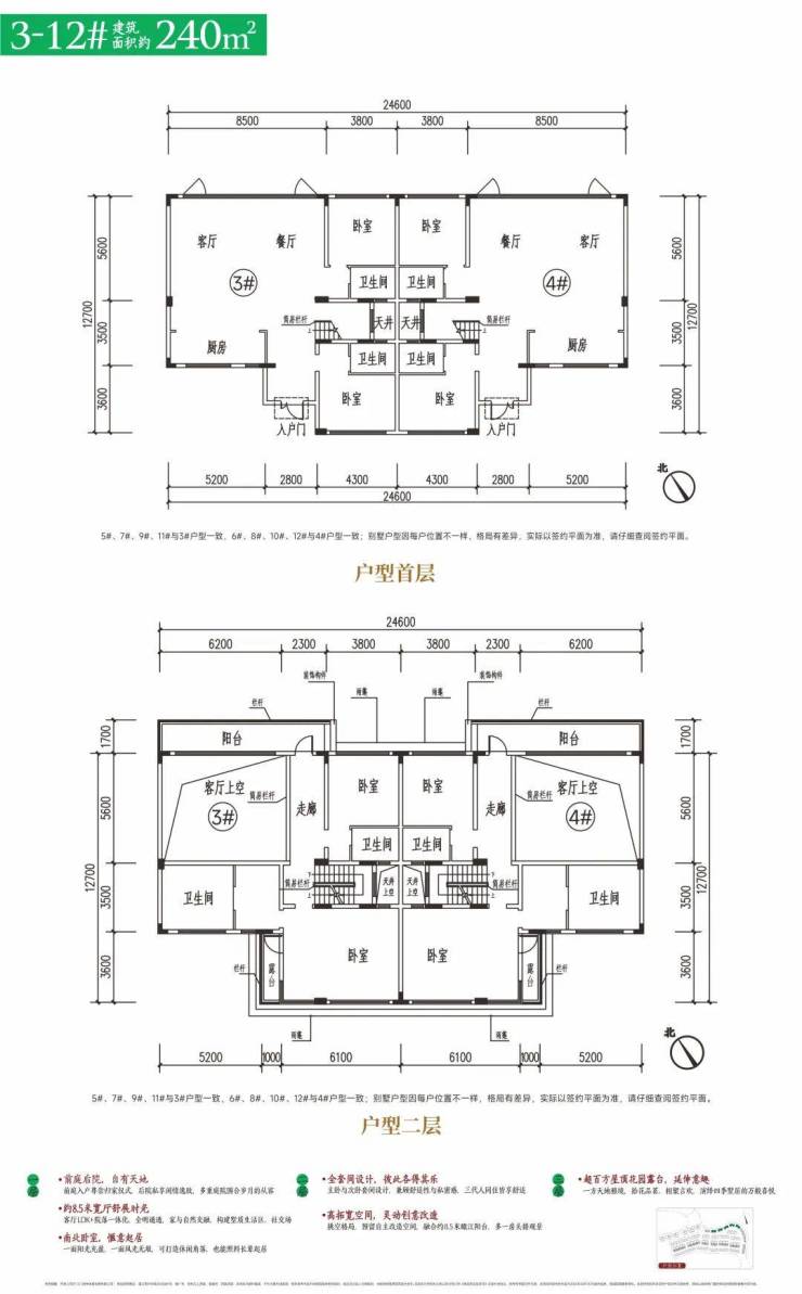 产品:前面1-12#是240㎡的南北向双拼类独栋别墅,产品设计初始时就是以独栋为原型做设计的,为两套打通为一套预留了充足的条件,部分房源在客厅即可以俯瞰西江,尊崇性极高。