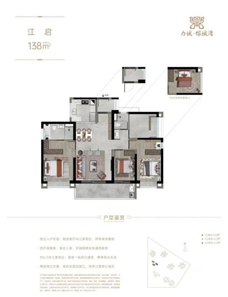 车位数 1041 其次,47%超高绿化率。打造社区6大主题园林,连通双公园,东门即7000m²大榕公园(在建),南门即规划1.2万m²滨江生态公园(规划)。交通配套 ;从地铁口花地湾出来,步行到项目约3公里29分钟,这个距离还是有点远,就不建议步行。可以通过坐公交车到达楼盘,有3路公交车可以直达项目,约10分钟左右,这个还是相对便利。距离楼盘600米左右有个远期规划的25号线的汾水站,后续就可以一个站就到花地湾,大大减少同行时间。商业配套;自带建面约60万方商业综合体规划,距离茶窖市场近,周边大部分都是做茶叶和批发的生意,建材和五金等,谈不上繁华。我们有朋友以前也在芳村待过两年,对于这边村子还是比较多的,芳村地铁口附近的有个肉菜市场,东西还是非常便宜。在力诚榕诚湾项目400米左右有乐家生鲜,雅源小百货,春仔生活超市,基本能满足生活需求。教育配套 ;诚汇新都内配建5所学校,其中第一所配套学校已动工,配建48班中小学,预计明年建成招生,目前正与品牌教育集团接洽合作事宜。项目已确定真光学校教育集团医疗配套;广州市第一医院鹤洞分院、广州市中医医院和惠爱医院。前沿综合医院环绕,全面照护:省中医院芳村分院、中医药大学第三附属医院、荔湾区人民医院、荔湾区人民医院新院区(已运营)和广钢新城医院等。产品:项目共有8栋住宅和1栋商业楼。其中,19-1、19-3、19-6住宅有32层,19-2、19-8有46层、19-7有43层,19-9和19-10则高达48层,而商业楼宇有2层,在售建面约85—168方3/4室。均价3.2-3.7w,83方户型总价268万可以买到。建面约85㎡,主城瞰江小户,小面积也能轻松瞰江,三开间连续景观面,客厅阳台一体,引江景入室,让揽江生活不再是奢望,而且这个户型是楼盘最便宜的,总价330万左右,单价3.8万。建面约97㎡,江园双景臻席,不仅能欣赏花地湾江面卓绝风光,还能俯瞰榕诚公园,以及GVL怡境国际匠心打造的“山林麓畔 隐翠森居”主题大师园林,LDK餐客厨一体设计,约6.5米宽境阳台。建面约138㎡,望江大平层户型,四开间朝南,采光、通风好,拥有独立入户花园和约6.8米的江景阳台,进一步拉升改善住户的居住体验。建面约165㎡,打造南北双阳台,南向四开间望江,观景阳台的长度能够达到8.8米,在观景体验上,是几个户型中最好的。