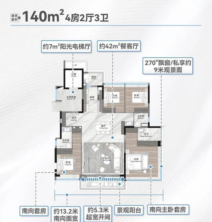 建面140平四房三卫,入门级户型,部分也可望到湖景,双套房设计,南向开间,两个次卧之间没有承重墙,打通后可做成3个套房,另外独梯入户,全屋12%收纳比,配置超大玄关柜,总价1000-1300万左右。