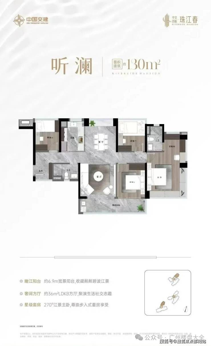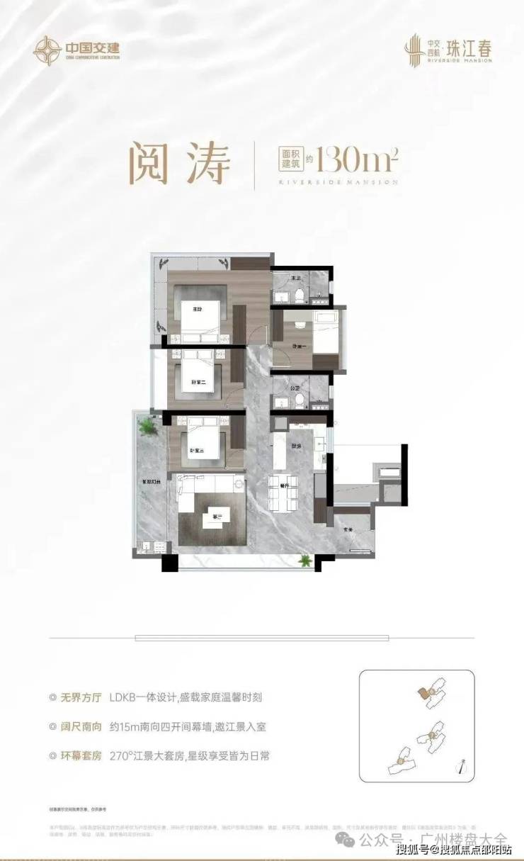 130㎡四房,带入户玄关,传统的竖厅设计,做到南北对流,景观阳台约6.9米长,连通次卧,主卧套房设计,还带270°大飘窗。均价3.9万起。中交四航·珠江春售楼处电话:400-150-5057