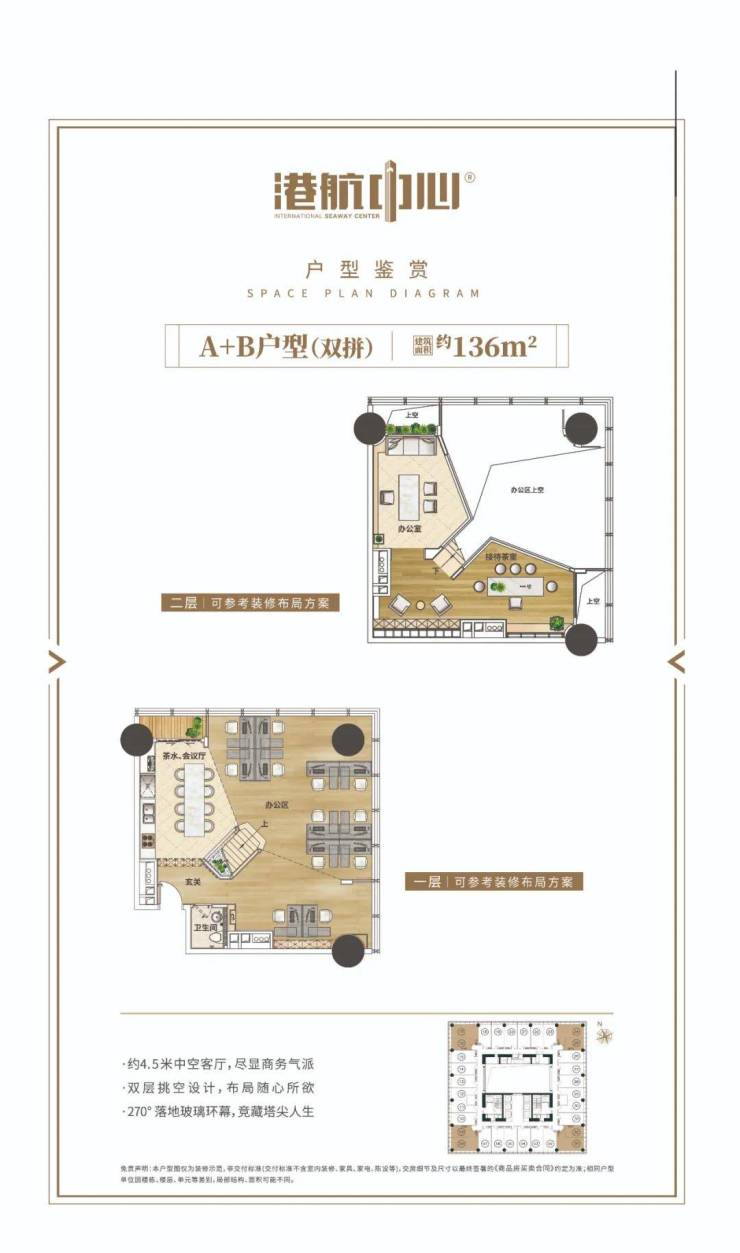 项目一期目前在售250米高区60-136m²小型办公楼,层高4.5米,空间间隔灵活、利用率高,满足企业对个性化及功能多元化的追求。
