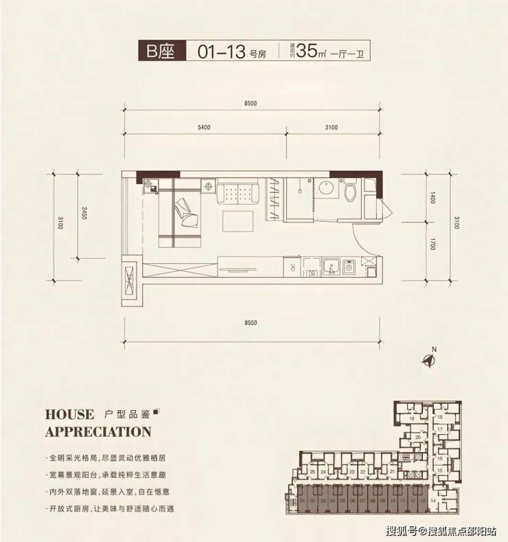 单房户型,东南朝向视野开阔,开间3.1米配有落地窗,采光性能佳。开间进深比良好,空间利用充分,功能全面。厨卫空间紧凑实用。