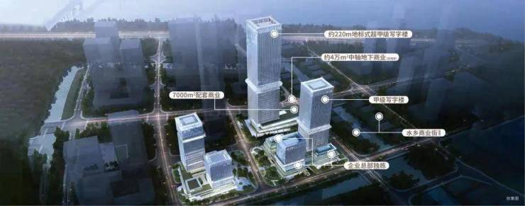 项目规划有1栋超220m地标式超甲级写字楼,刷新区域商务新高度。