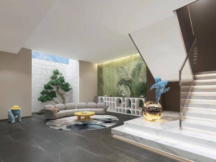 双层会客厅更是将自在墅居生活演绎得淋漓尽致。一层留给男主人社交会友,约见重要宾客进行商务会谈,灵感创意碰撞;一层留给家人休憩娱乐,妻子练习插花,父母静看报纸,孩子们嬉戏追逐,阔绰空间让全家生活互不干扰,各有主场。