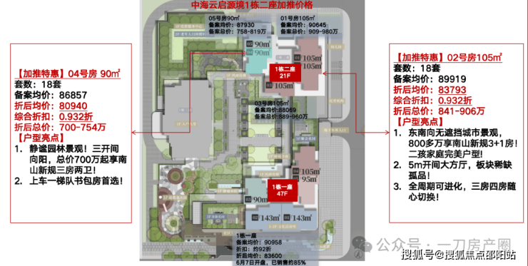 本次推出的楼栋70米层高,其中:90㎡36套、105㎡54套。本次仅加推02、04两条梯腿(合计36套享受开盘优惠0.932折、其他房源暂无优惠),总价700-900万!