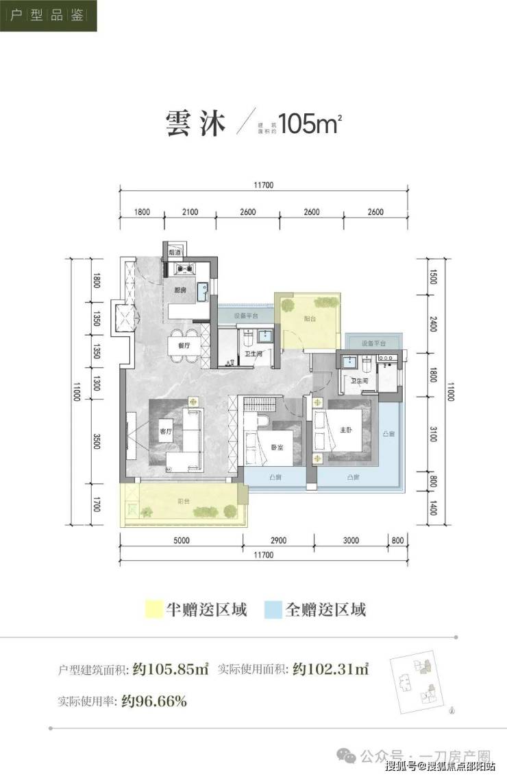 02号房,105㎡3+1房2卫,折后均价:8.38万,总价约:841-906万