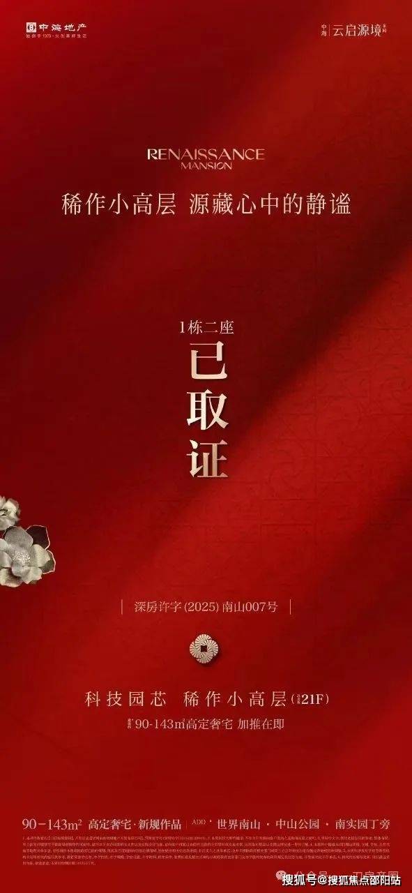 南山科技园板块唯一一个央企开发的项目——【中海云启源境】今天拿证,预计8月2日开盘选房。加推1栋二座最后90套90-105㎡稀缺小高层产品。