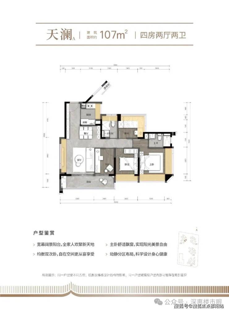 107㎡的4房2厅2卫,设计的是经典竖厅格局,客厅4米开间,LDKB一体化,S墙设计预留冰箱卡槽位,动静分区,分别做到了主卧17.18㎡/次卧11.2㎡/次卧8.64m²/次卧7.68㎡(包含墙体飘窗),U型厨房,卫生间干湿分离,得房率约79.1%(不含赠送),客厅连接次卧出10.24m²观景大阳台,东南朝向。套内面积84.62m²+赠送面积22.96m²=实用面积107.58m²,加上赠送面积后得房率100.51%。