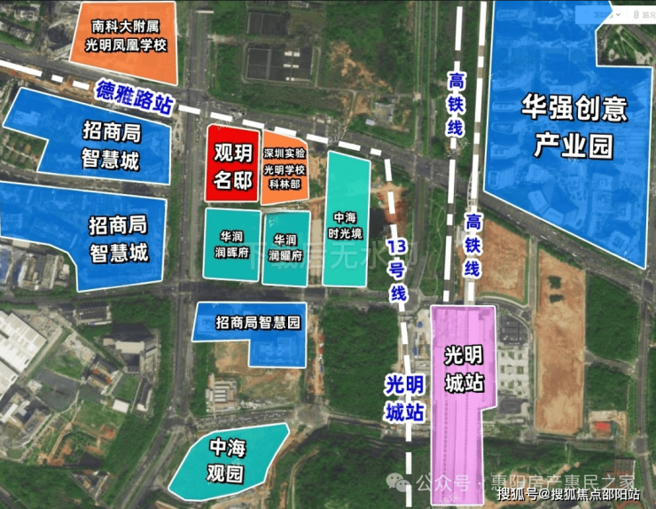 项目交通便利性突出,实现"三轨三高速"立体交通网络。距离在建的13号线德雅路站仅100米(预计2026年中开通),7站直达南山科技园等核心区域;1站可达光明城站,换乘6号线支线二期(2025年年内开通)及广深港高铁、赣深高铁,30分钟直达香港西九龙、广州等城市。