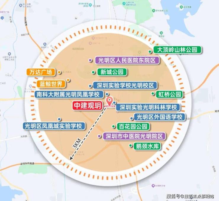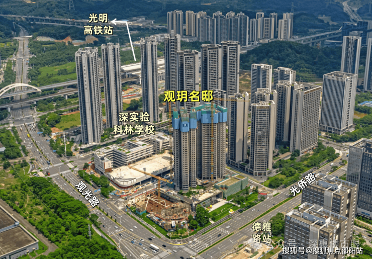 中建观玥名邸,位于光明区凤凰街道光侨路与观光路交汇处东南侧,地处光明科学城核心区与凤凰城板块交汇处,是光明高铁站板块最后一块住宅用地。作为光明科学城"一心两区"战略布局中的关键节点,项目紧邻区政府、文化艺术中心等行政文化配套,2公里范围内覆盖蓝鲸世界、万达广场等成熟商圈,坐享"15分钟社区生活圈"便利。依托光明科学城建设世界级原始创新高地的规划,项目所在区域将受益于大量高端科学人才涌入带来的区域价值提升,同时享有"北林、中城、南谷"差异化城市风貌中的"乐活城"特质,兼具科技感与宜居性。