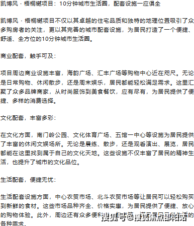综上所述,凯博风・梧桐樾项目以其完善的城市配套设施和便捷的10分钟生活圈,为居民提供了全方位、多层次的生活服务。无论是购物、休闲、娱乐还是医疗、教育、游玩,居民都能在这里找到满意的选择。如果你正在寻找一个宜居宜业的理想家园,那么凯博风・梧桐樾绝对是一个值得考虑的选择。