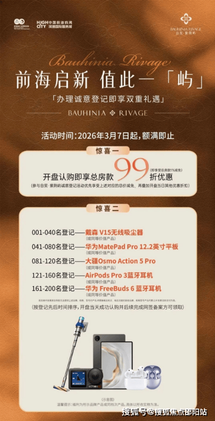 前海妈湾湾啟紫荆府二期(紫荆屿)将于4月9日正式开放实体样板房,已诚意登记会优先参观),登记可享众多惊喜(参考下图),预4月中下旬开盘入市,面积段108-129-148㎡3-4房。