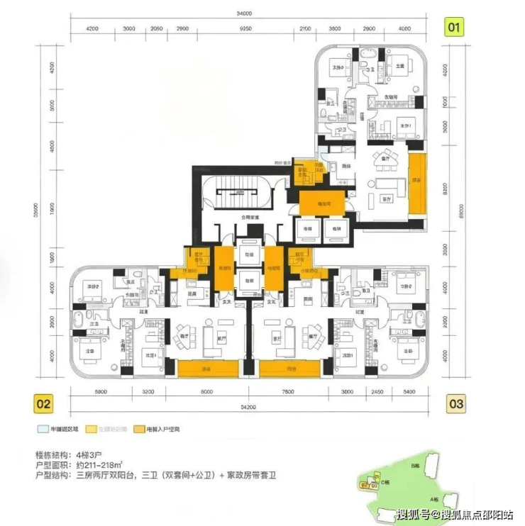1C栋 210-217㎡:项目制高点(总高约192米),4梯3户,为追求核心地段与绝佳视野的新贵提供品质入场券。