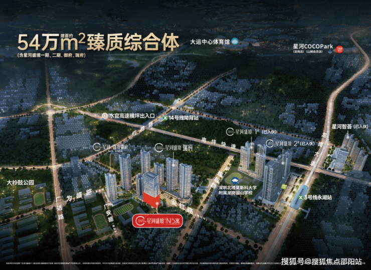 约54万㎡臻质综合体(含盛境一期、二期、御府、瑞府),集住宅、商业、公寓、办公等于一体,打造星河大城品质生活圈。