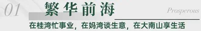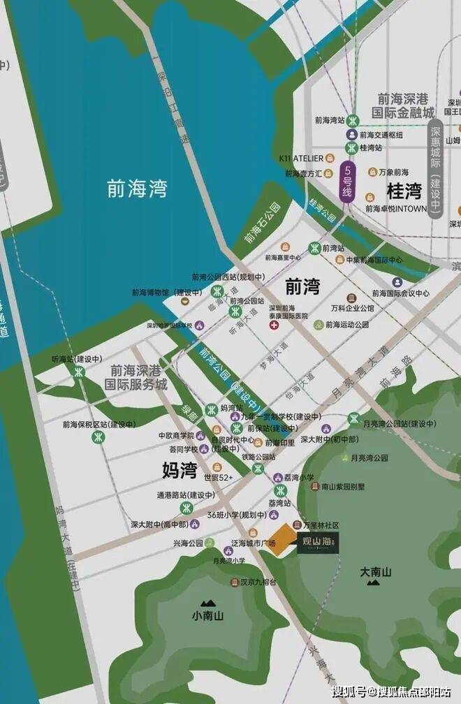 大南山生态住区项目所在前海合作区大、小南山片区西组团规划定位重点安排教育、配套、体育等公共服务设施和生活服务设施与【桂湾】国际金融城和【妈湾】深港国际服务城两大前海核心区引擎形成前海黄金三角,工作、生意生活尽在掌握山海通廊:约650米两个红绿灯,咫尺2.9k㎡妈湾理想城市约 53.8 公顷绿地公共空间,营造全域公园城市,宜业宜居的绿色人文之城