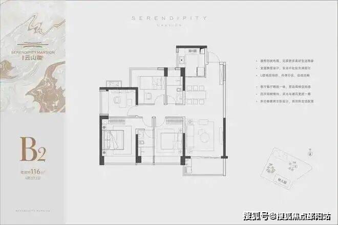 设计上跟建面约116㎡B2户型类似,不过公摊、尺寸和细节上有不同。该户型取消了小次卧的L型飘窗设计,采用了大阳台的设计横穿到次卧,主朝向的视野更开阔。动静分区,四开间南向。经典的竖厅格局,动静分离,一体化餐客厅让空间观感更通透。约6.8米南向阳台视野开阔,次卧连接阳台可以看到园林景观,绿意在前,在阳台晾晒衣服时也是一种享受。经典的竖厅格局,动静分离。客厅、厨房、餐厅和阳台也能实现空间一体化,构成家的核心区。
