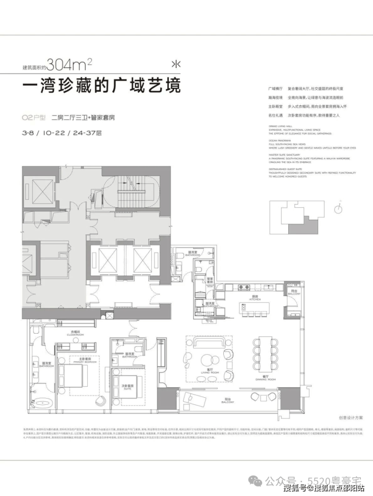 公寓主力户型为304㎡、327㎡、402㎡、570㎡以及1032㎡,公寓层高3.6米,低区5T3,高区5T2。