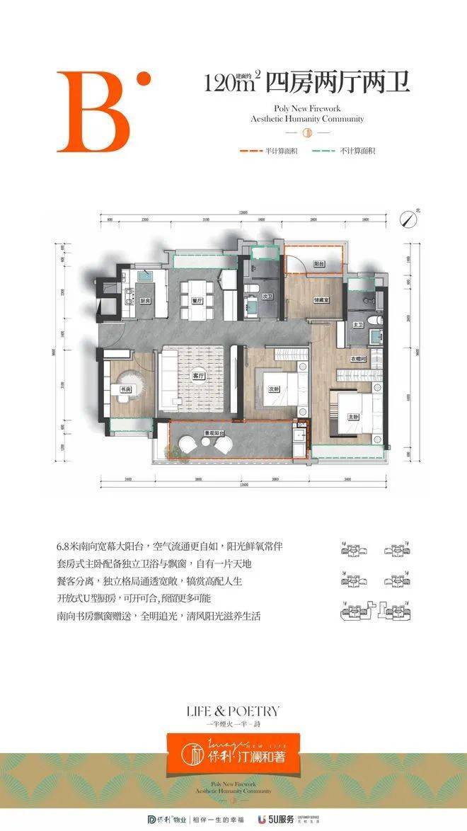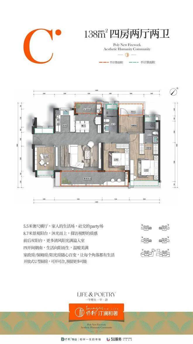 项目提供 109㎡三房、120㎡和 138㎡四房选择,平均得房率超 87.6%,同等面积多一房。所有户型坐北朝南、南北通透,还有大尺度景观阳台、双阳台、可变空间等设计,度假、改善皆宜。