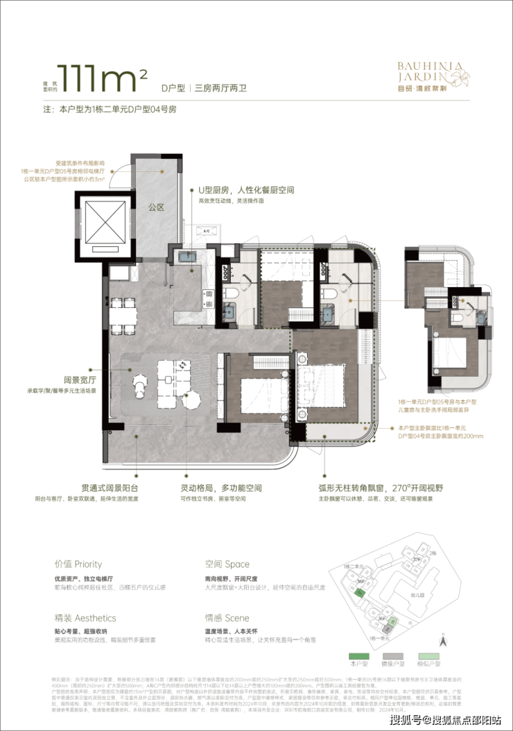 双龙抱珠户型,整个户型非常通透。书房分布于客厅另一侧,难得的双面采光+270°景观视野。主卧南北通透,景观面开阔。