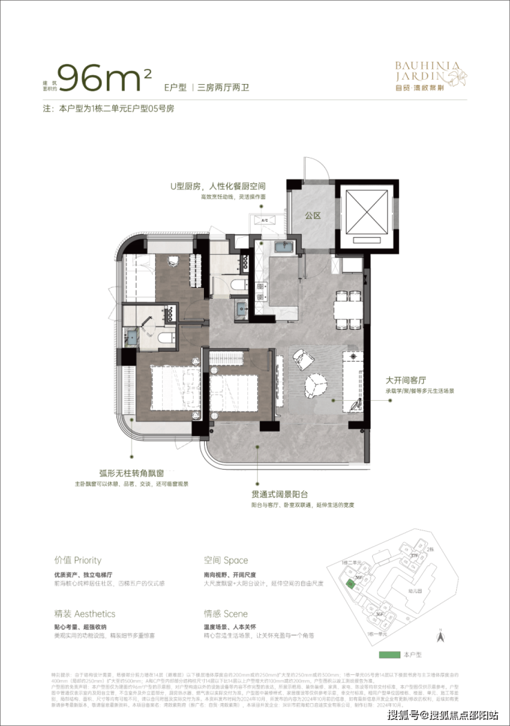 四房为主,多种厅式可选;大面积的飘窗利用,采光面大、实用率高;转角处使用弧形玻璃且都是无柱设计,景观视野佳;
