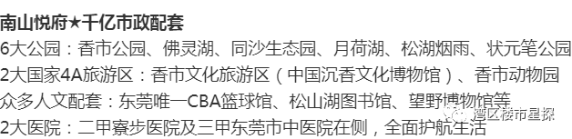 生态文体:6大公园:香市公园、佛灵湖、同沙生态公园、月荷湖、松湖烟雨、状元笔公园;2大国家4A旅游区:香市文化旅游区(中国沉香文化博物馆)、香市动物园;3大文体项目:东莞唯一CBA篮球馆、松山湖图书馆、望野博物馆等众多人文配套;