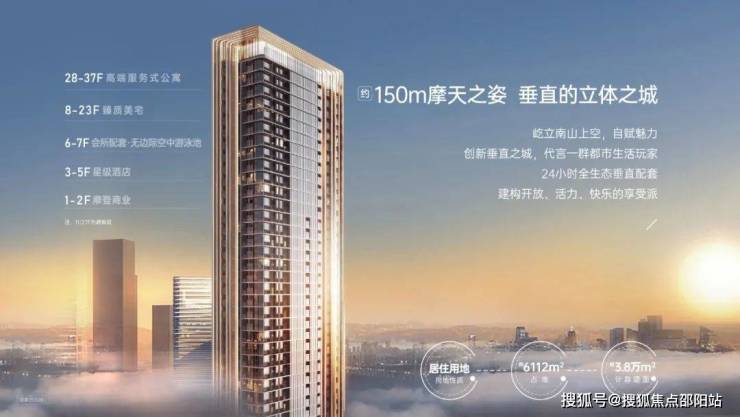 约150米垂直业态综合体,通高弧型双银超白玻璃立面,如水晶之塔。涵盖摩登商业、休闲会所、空中泳池、臻质美宅、星级酒店&高端服务式公寓。