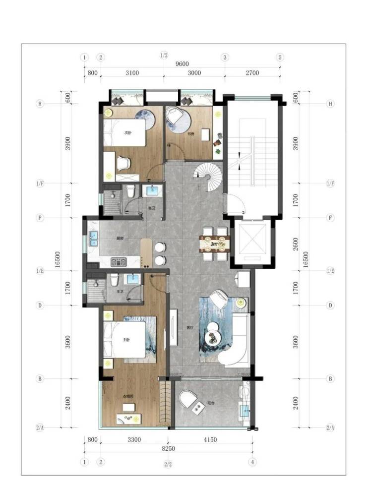 3.下叠:建筑面积约100-110㎡,四房三厅三卫。