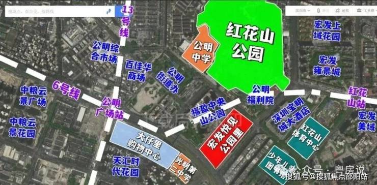 宏发悦见公园里,位于光明区公明街道松白路与红花中路交汇处,该片区属于公明最核心的区域,背靠红花山公园,一路之隔对面是大仟里购物中心,西侧是红花山体育中心,光明区图书馆(红花山分馆),6/13号地铁线双地铁口物业,分别是”红花山站","公明广场站"