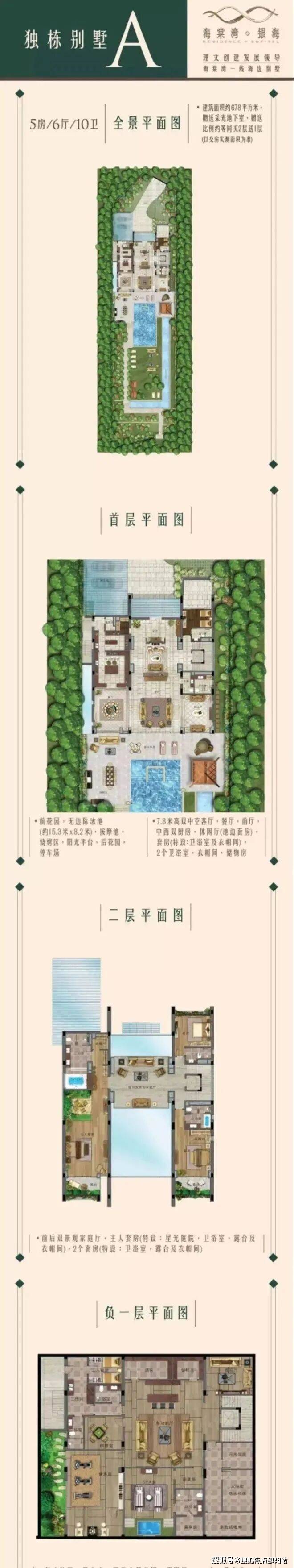 A户型 1.9亿:建筑面积730㎡,实际使用960平,占地约2200平,5房10卫,层高8.2米。庭院花园配备150平超大泳池,庭院设有L型超大水系,超长进深,庭院直达海滩