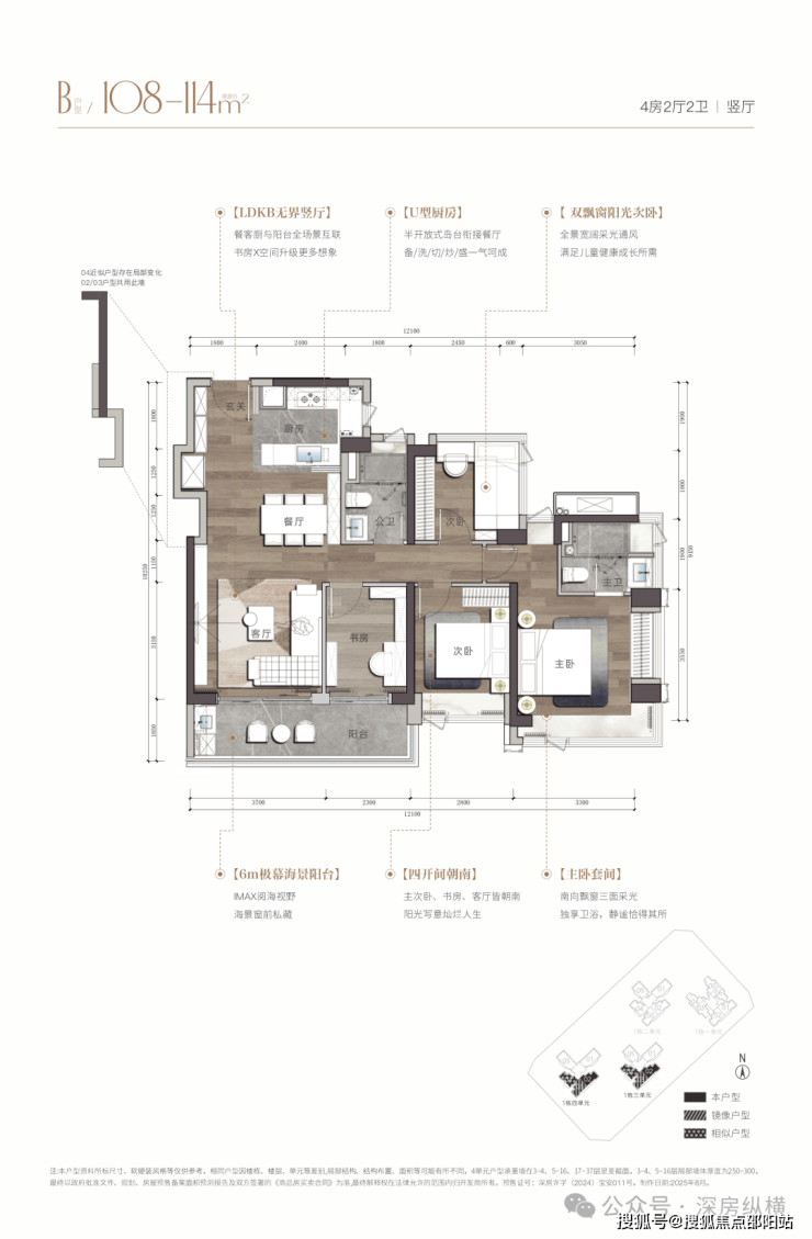 建面约108-143㎡海幕纯四房,臻藏级南向湾海视野,LDKB人性化动线设计,格局方正、高实用率,打造独立玄关、双飘窗主卧、步入式衣帽间等个性化空间。
