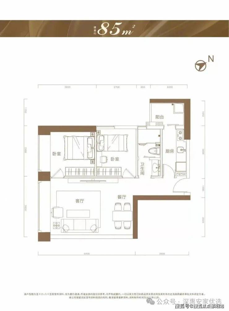 85㎡:2房2厅1卫
