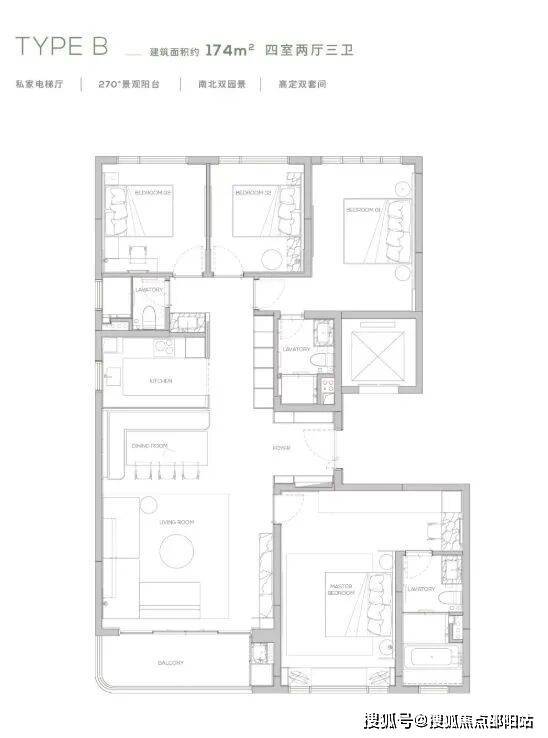 卧室设计注重舒适性,主卧套房配备独立卫生间和衣帽间,空间宽敞,可打造舒适的休息空间。其他三间卧室也能满足家庭不同成员的居住需求,可作为儿童房、老人房或书房等。此外,户型采用【M + 科技系统】,从空气、饮水、环境等核心要素出发,选用优质材料和工艺,为业主提供绿色健康、智慧便捷的居住体验,满足现代高品质生活的需求。