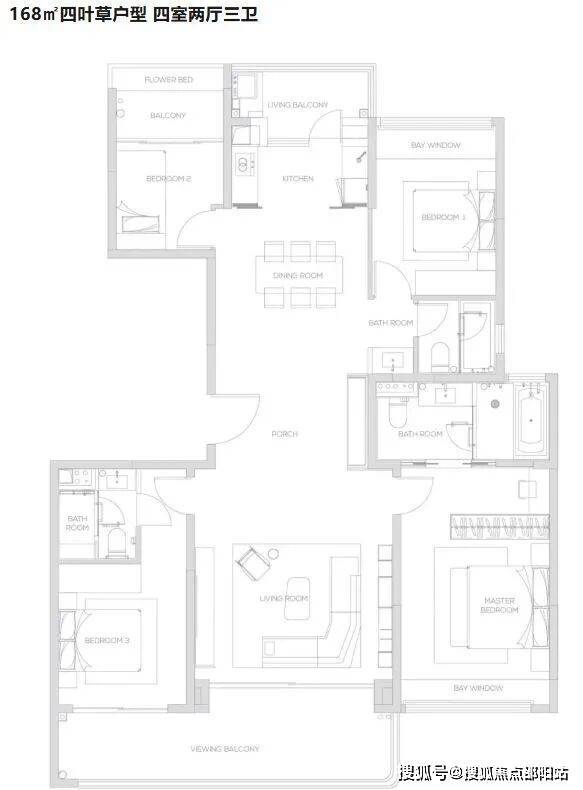 该户型采用四叶草布局,四个房间分布在户型四角,互不干扰,保障了家庭成员各自的私密性。客厅、餐厅一体化设计,空间开阔,与阳台相连,采光通风俱佳,可享受充足的自然光线和清新空气。阳台采用弧形设计,拥有 270° 环幕视野,站在阳台上,既能俯瞰社区内的园林景观,又能远眺周边的山林湖泊,将自然美景尽收眼底。