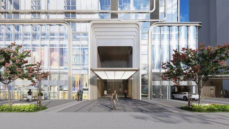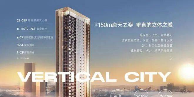 约150米垂直业态综合体,通高弧型双银超白玻璃立面,如水晶之塔。涵盖摩登商业、休闲会所、空中泳池、臻质美宅、星级酒店&高端服务式公寓。