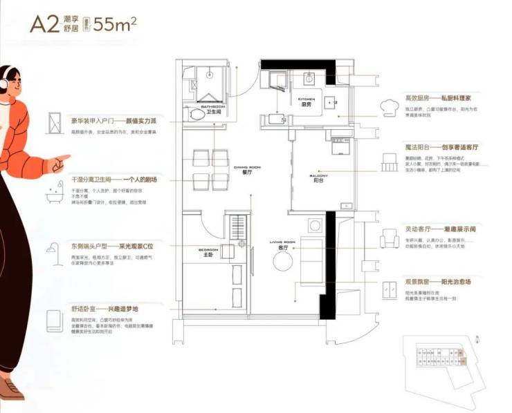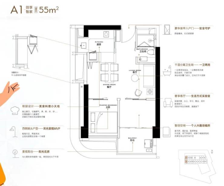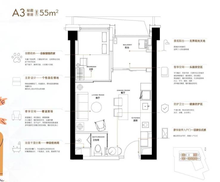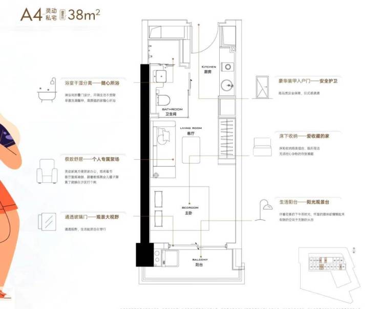 面积:38-55㎡1-2房,38㎡1房1卫;55㎡2房1卫