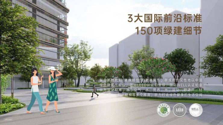 匠心打造示范级园林。引入全球绿色、健康建筑评价体系,致力成为LEED铂金+WELL铂金+国标三星运营认证的标杆项目,打造健康社区、环保生态、节约资源等全方位绿色建筑体验,构建健康生活方式