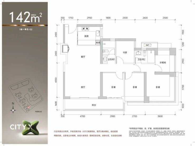 142㎡的4房2厅2卫,1栋1单元02户型,设计的是经典竖厅格局,进门入户玄关,客厅4.7米开间,LDKB一体化,S墙设计预留冰箱卡槽位,四开间朝南,动静分区,4个卧室分别做到了主卧24.03㎡/次卧9.99㎡/次卧8.99㎡/次卧7.6㎡(包含墙体飘窗),U型厨房,公卫三段式分离,得房率约75.4%(不含赠送),客厅连接次卧出12.16㎡的观景大阳台,东南朝向。套内面积107.06㎡+赠送面积14.75㎡=实得121.81㎡,加上赠送后得房率约85.78%。还未推售