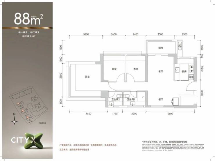 88㎡的3房2厅2卫,设计的是竖厅南北通透格局,客厅3.3米开间,LDKB一体化设计,四开间朝南,主卧270°无转角飘窗,3个卧室分别做到了主卧15.63㎡/次卧7.54㎡/次卧6.96㎡(包含墙体飘窗),U型厨房,卫生间干湿分离,得房率约74.6-75.4%(不含赠送),阳台主朝西北或东北向。套内面积66.45㎡+赠送面积11.58㎡=实得78.03㎡,加上赠送后得房率约87.56%。