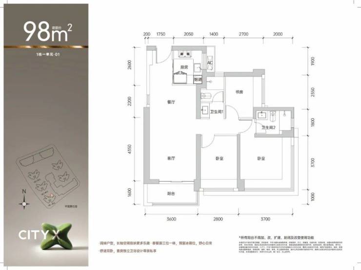 98㎡的3房2厅2卫,1栋1单元01户型,设计的是经典竖厅格局,进门入户玄关,客厅3.6米开间,LDKB一体化设计,动静分区,3个卧室分别做到了主卧14.3㎡/次卧10.36㎡/次卧6.75㎡(包含墙体飘窗),U型厨房,公卫三段式分离,得房率约75.4%(不含赠送),东北朝向。套内面积73.89㎡+赠送面积10.05㎡=实得83.94㎡,加上赠送后得房率约85.65%。还未推售