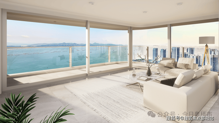 信悦湾主力户型客厅采用270°环幕无角柱设计,搭配弯弧玻璃、提升推拉门与大固定扇,将深圳湾大桥、歌剧院与城市繁华段全景引入室内,尽揽湾区美景。“L”形阳台则进一步延伸了观景界面,无遮挡直面海港景观。