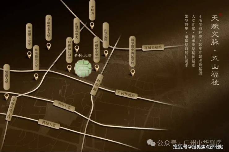 项目位于天河五山汇景新城板块内,珠江新城和琶洲金融城两中轴间的核心位置,楼盘身后就是汇景20年醇熟的圈层配套