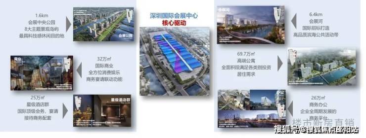 约160万㎡深圳会展中心,约154万㎡会展综合配套,形成包含城市地标、产业总部、商业中心、国际酒店群、产业展馆、精品公寓、生态公园、交通枢纽等复合功能物业群,构建集全球信息交流和消费体验于一体的会展商务平台